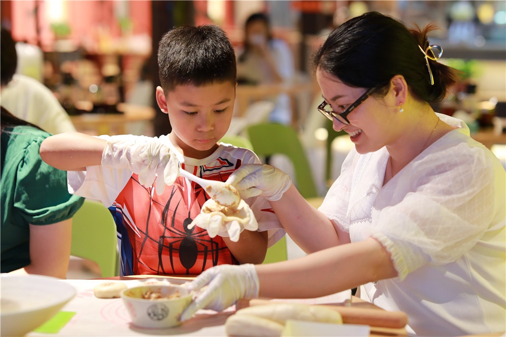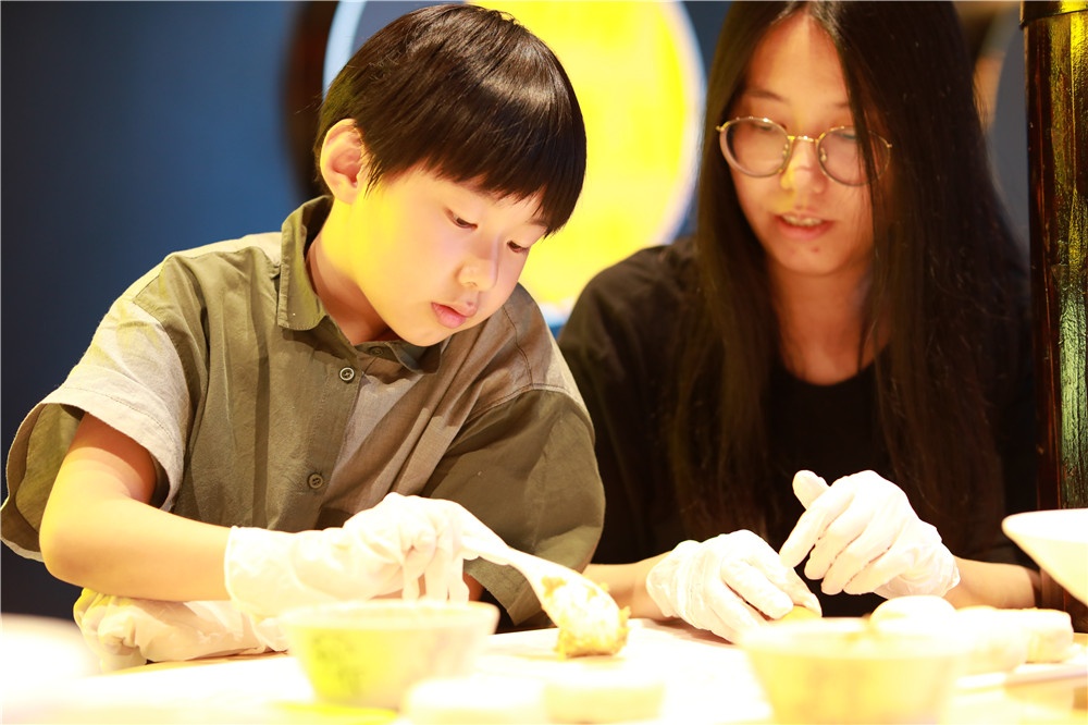 一個鮮(xian)肉月(yue)餅(bing)最重(zhong)要的是酥皮部(bu)分,首先將豬(zhu)油(you)、水與面(mian)(mian)粉按(an)比(bi)例調和(he),再經(jing)過反復攪拌、揉面(mian)(mian)、折疊“千錘百煉”后(hou)方可成(cheng)為一塊合(he)格的餅(bing)皮,然后(hou)包裹鮮(xian)肉揉搓成(cheng)球,輕(qing)輕(qing)按(an)壓敲上月(yue)餅(bing)專屬“紅(hong)章”進行烤制,二十分鐘后(hou)香噴噴的鮮(xian)肉月(yue)餅(bing)便新(xin)鮮(xian)出(chu)爐了(le)。小(xiao)朋友們(men)津(jin)津(jin)有味品(pin)嘗(chang)著(zhu)自己(ji)的勞動(dong)成(cheng)果,還和(he)現場(chang)工(gong)作人(ren)員分享,臉上洋(yang)溢著(zhu)自豪(hao)開心(xin)的笑容。