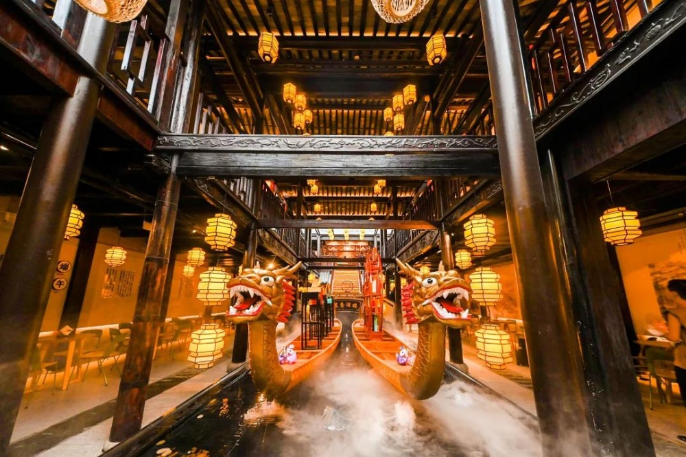 輕啟朱門,粉墻黛瓦(wa),詩情畫意(yi),一(yi)派風(feng)情。抬望眼(yan),霸氣的(de)龍舟立(li)于中庭,江南韻(yun)味(wei)十足的(de)中式閣樓、小橋流水應有盡(jin)有。傳(chuan)統的(de)木質鉚接樓面,二(er)十四節氣之(zhi)景掩映(ying)其中,好一(yi)派溫柔(rou)的(de)江南風(feng)情。